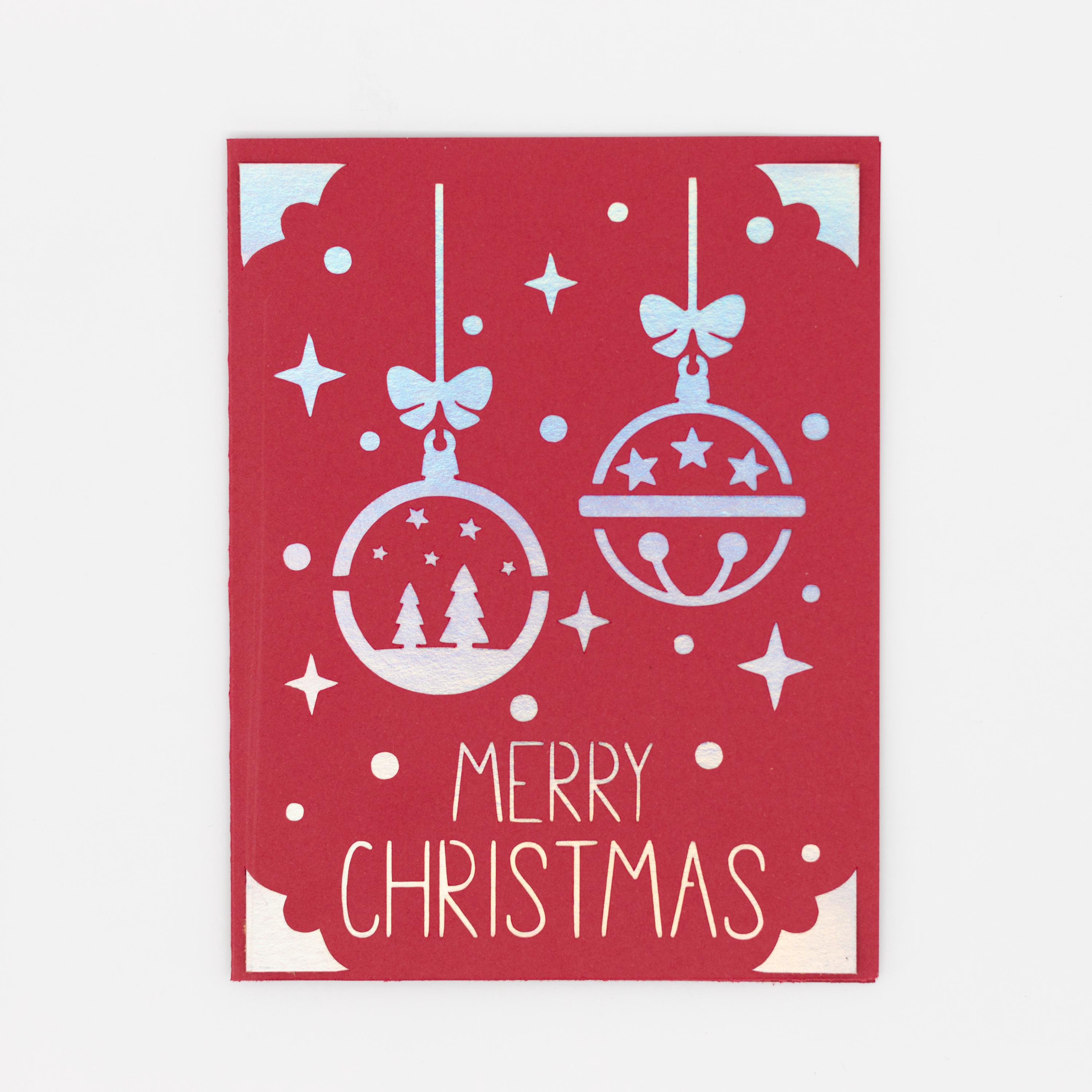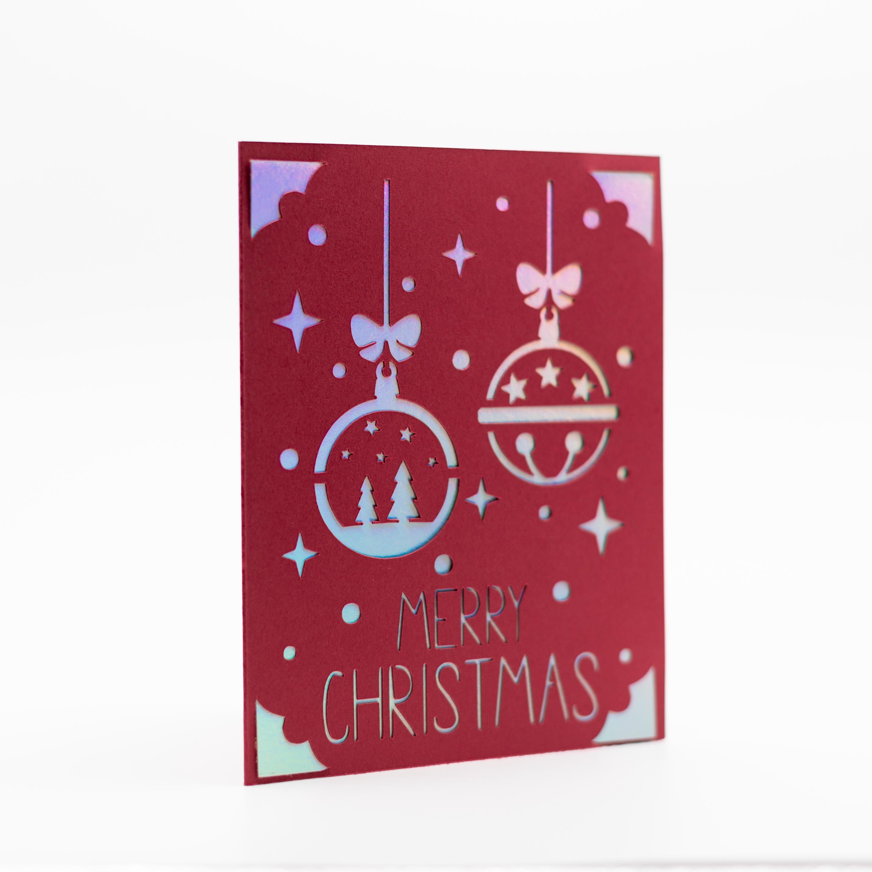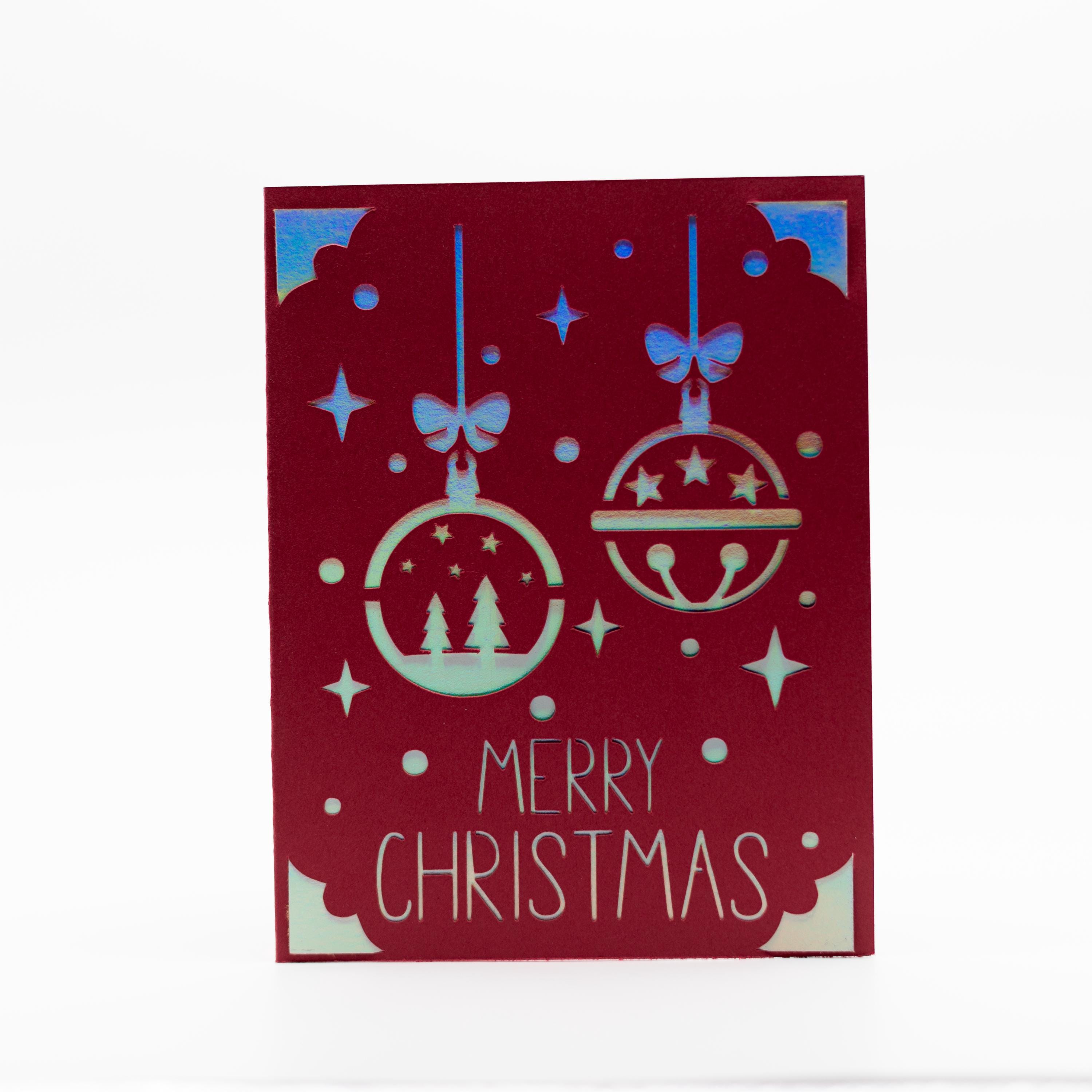 This handcrafted Christmas card from Unique Sentiment radiates elegance and warmth, featuring iridescent cut-out ornaments that shimmer against a wine red backdrop. Each ornament—one cradling twin Christmas trees, the other a bell surrounded by stars—symbolizes cherished memories and hopeful wishes, framed by celestial accents and delicate corner flourishes. Designed to be more than a greeting, it tells the story of a quiet winter night where love, tradition, and artistry come together in a single heartfelt keepsake.