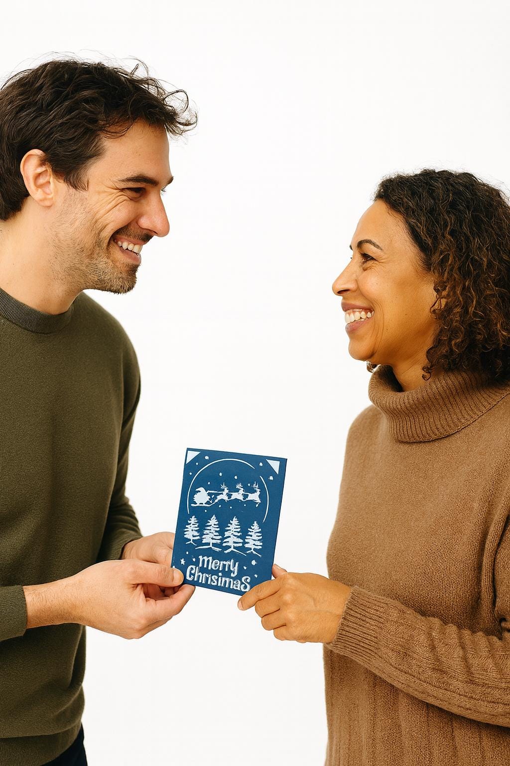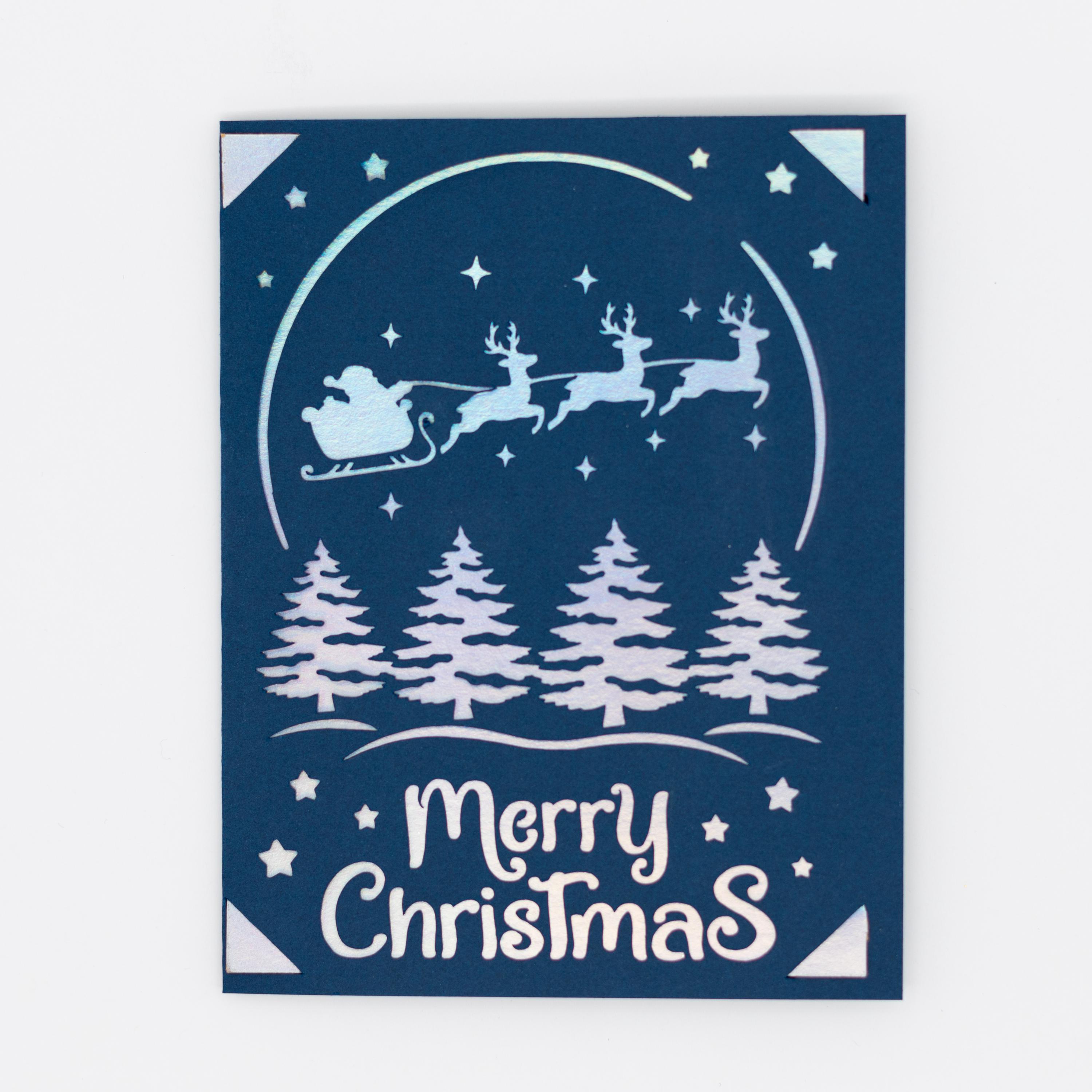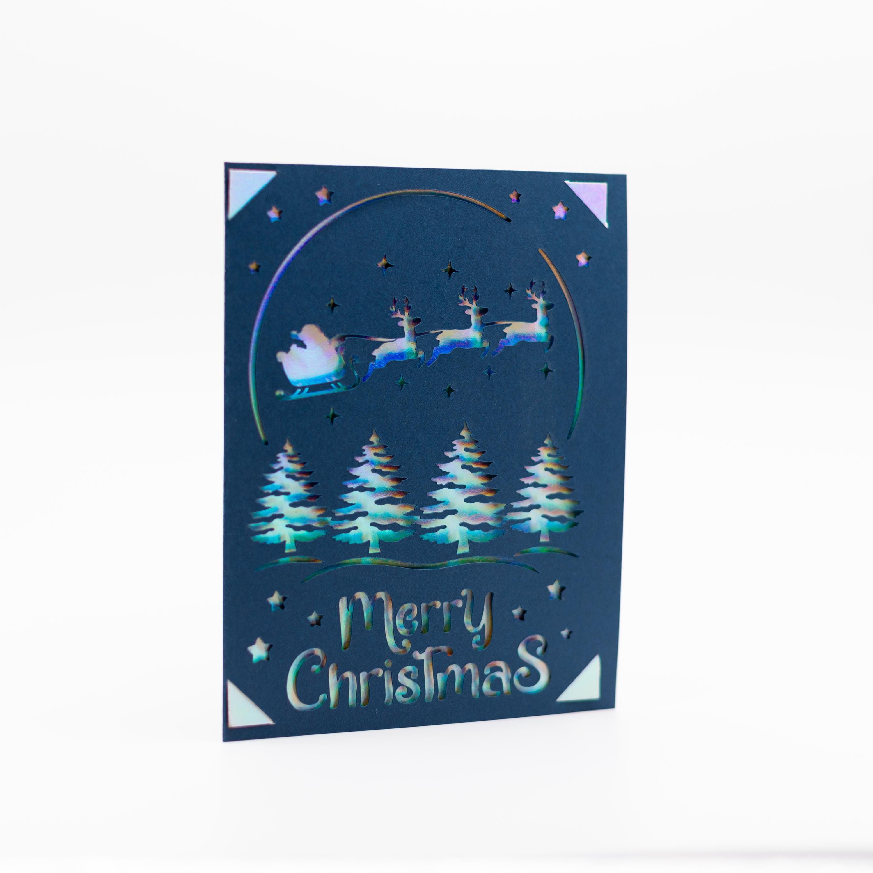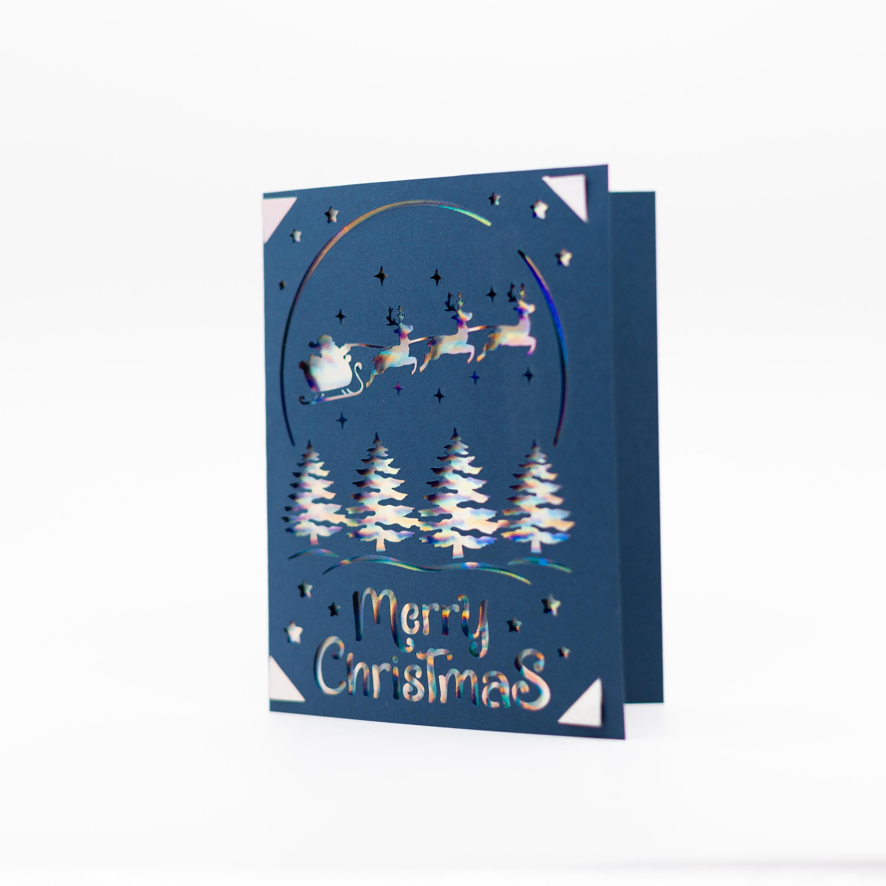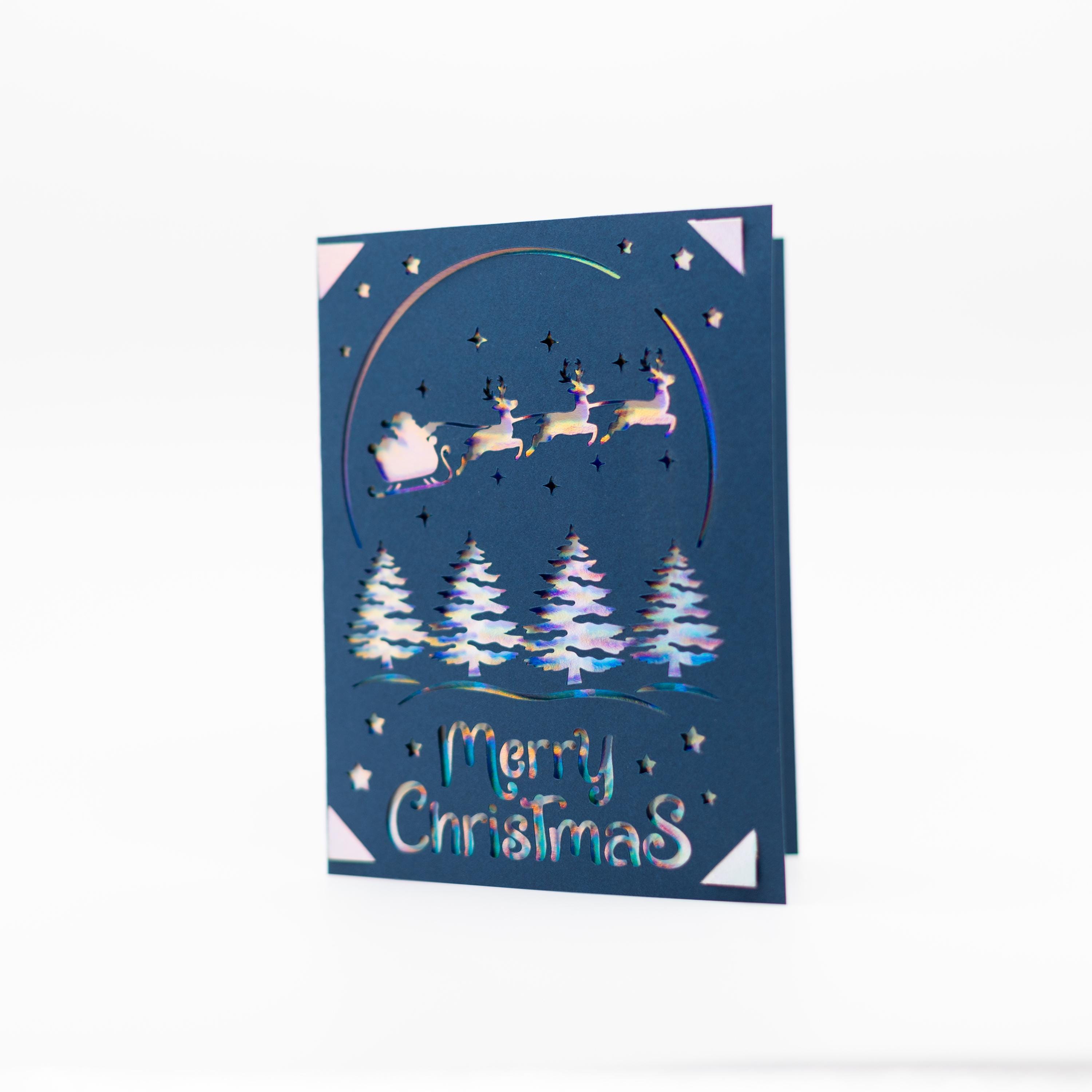 This enchanting Christmas card from Unique Sentiment features Santa soaring across a midnight blue sky, his sleigh trailing three reindeer above a forest of shimmering pine trees and twinkling stars. The holographic white cut-outs evoke a sense of motion and wonder, capturing the magic of a silent night when dreams take flight. Inspired by childhood awe and the timeless joy of giving, this card becomes a treasured keepsake—reminding us that love, imagination, and tradition are the true gifts of the season.